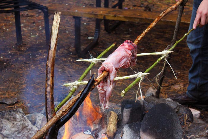 were purchased from a local farm and were skinned, cleaned and cooked as stew, in a pit and on a spit over a fire.